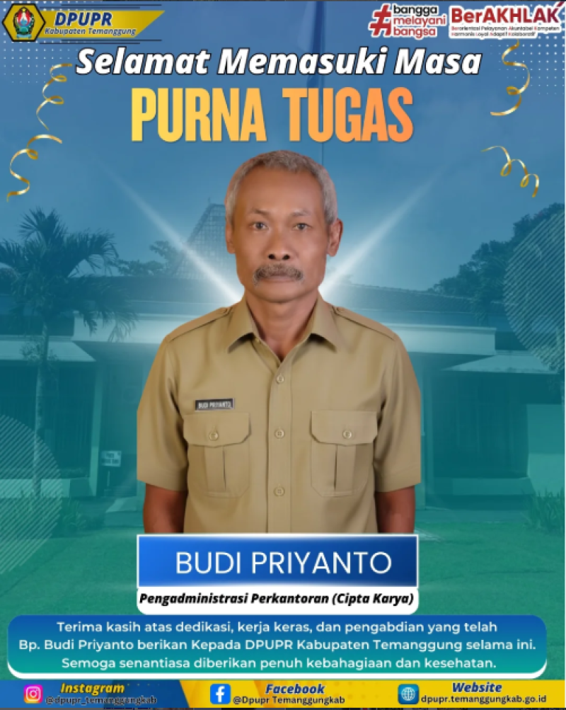 Berita Kategori: Smart Government (Pemerintah Cerdas) Bidang Cipta Karya Minggu, 01/03/2026 10:35 0 Selamat Purna Tugas Bp. Budi Priyanto Selengkapnya Kategori: Smart Government (Pemerintah Cerdas) Sekretariat Jumat, 27/02/2026 10:34 0 Purna Tugas 24 Anggota KORPRI Kabupaten Temanggung, Penuh Haru dan Rasa Syukur Selengkapnya Kategori: Smart Government (Pemerintah Cerdas) Sekretariat Rabu, 25/02/2026 10:35 1 Peresmian Embung Geblog di Kecamatan Kaloran Selengkapnya Kategori: Smart Government (Pemerintah Cerdas) Sekretariat Selasa, 24/02/2026 10:36 2 Pendampingan Pengisian SPT Tahunan Selengkapnya Kategori: Smart Government (Pemerintah Cerdas) Sekretariat Sabtu, 21/02/2026 10:33 1 Hari Peduli Sampah Nasional (HPSN) 2026 Selengkapnya Kategori: Smart Government (Pemerintah Cerdas) Sekretariat Kamis, 19/02/2026 10:32 0 Rapat Koordinasi LPPD Antar Bidang Selengkapnya Kategori: Smart Government (Pemerintah Cerdas) Sekretariat Kamis, 19/02/2026 10:31 0 Desk Pendampingan Pelaksanaan Evaluasi AKIP Mandiri PD Tahun 2026 Melalui Aplikasi Evakip Selengkapnya Kategori: Smart Government (Pemerintah Cerdas) Sekretariat Rabu, 18/02/2026 10:30 0 jam kerja DPUPR Kabupaten Temanggung selama Bulan Ramadan 1447 H / 2026 M Selengkapnya Kategori: Smart Government (Pemerintah Cerdas) Sekretariat Rabu, 18/02/2026 10:29 0 Selamat Menunaikan Ibadah Puasa Ramadan 1447 H / 2026 M Selengkapnya Kategori: Smart Government (Pemerintah Cerdas) Sekretariat Rabu, 18/02/2026 10:28 0 Marhaban Ya Ramadan 1447 H/2026 M Selengkapnya Kategori: Smart Government (Pemerintah Cerdas) Sekretariat Rabu, 18/02/2026 10:27 0 Forum Internal Perangkat Daerah Tahun 2027 Selengkapnya Kategori: Smart Government (Pemerintah Cerdas) Sekretariat Senin, 16/02/2026 10:25 0 Selamat Tahun Baru Imlek 2026 Selengkapnya FirstPrev7891011NextLast